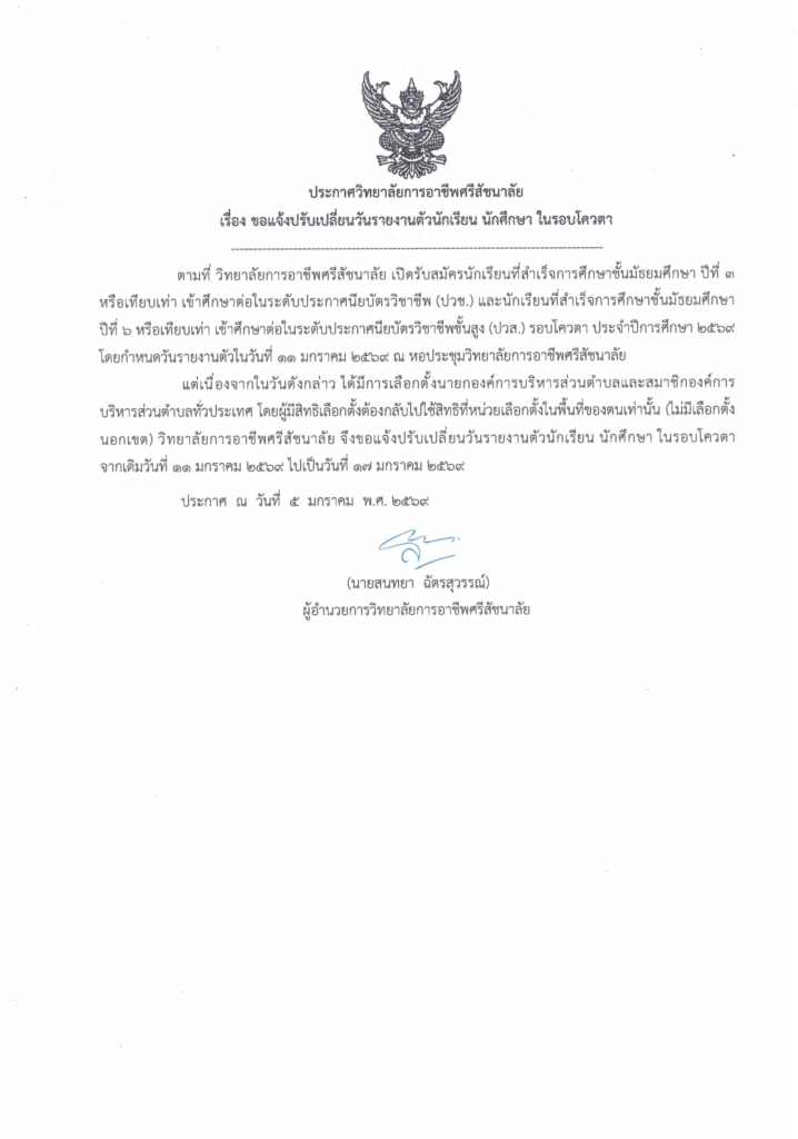 แจ้งเปลี่ยนวันรับรายงานตัว รอบโควต้า 6 ม.ค. 25696 ม.ค. 2026นางสาวจิราพรรณ ม่วงตาลข่าวสาร, ประกาศ จำนวนผู้เข้าชม : 42