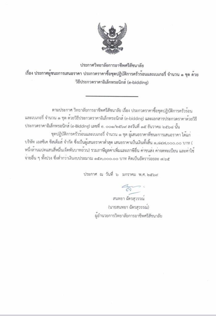 เรื่อง ประกาศผู้ชนะการเสนอราคา ประกวดราคาซื้อชุดปฎิบัติการครัวร้อนและเบเกอรี่ จำนวน 1 ชุด