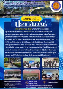วันที่ 24 มกราคม 2569 นายสนทยา ฉัตรสุวรรณ์ ผู้อำนวยการวิทยาลัยการอาชีพศรีสัชนาลัย ได้มอบหายให้ฝ่ายบริหาร และนางสาววาสนา พานมั่ง หัวหน้างานวัดและประเมินผล พร้อมทั้งคณะครู บุคลากรทางการศึกษาที่เกี่ยวข้อง ดำเนินการจัดการทดสอบทางการศึกษาระดับชาติด้านอาชีวศึกษา (Vocational National Educational Test : V-NET) ประจำปีการศึกษา 2568 ด้วยระบบดิจิทัล (Digital Testing) ได้ใช้ ห้องปฏิบัติการคอมพิวเตอร์ รองรับนักเรียน ระดับชั้นประกาศนียบัตรวิชาชีพ (ปวช.) ชั้นปีที่ 3 ทุกสาขาวิชา เข้าทำการทดสอบดังกล่าว โดยได้รับเกียรติจากนายสมใจ รอดคง ผู้อำนวยการวิทยาลัยเทคนิคสุโขทัย ปฏิบัติหน้าที่ผู้อำนวยการสำนักงานอาชีวศึกษาจังหวัดสุโขทัย เป็นประธานในการตรวจเยี่ยมศูนย์ทดสอบ และให้กำลังใจกับนักเรียน-นักศึกษาและครูผู้มีส่วนเกี่ยวข้อง